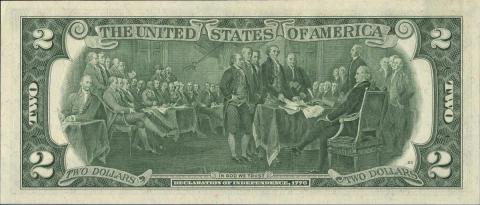 Юбилейный выпуск в честь 200-летия подписания Декларации независимости. На лицевой стороне - портрет Томаса Джефферсона, на реверсе - репродукция картины Джона Трамбэлла. Из-за размера банкноты не все подписавшие Декларацию поместились на банкноте.
