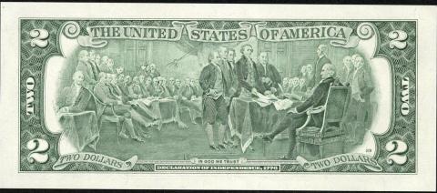 На лицевой стороне - портрет Томаса Джефферсона, на реверсе - репродукция картины Джона Трамбэлла. Из-за размера банкноты не все подписавшие Декларацию поместились на банкноте.