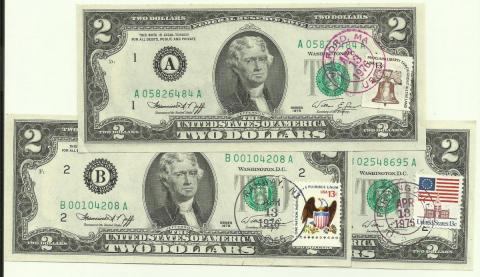 В первый день выхода в свет Легендарной юбилейной банкноты в два доллара США 1976 года - 13 апреля 1976 год (день рождения Томаса Джефферсона), некоторые особо расторопные нумизматы успели наклеить на эти банкноты почтовые марки и поставить на них почтовый штемпель в ближайшем почтовом отделении. Причем особенно ценными считаются банкноты, на которых марка номиналом в 13 центов.