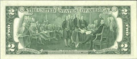На оборотной ее стороне изображено принятие Декларации независимости. Этот рисунок является репродукцией с картины известного американского художника Дж. Трамбулла "Подписание Декларации независимости" - одного из восьми огромных полотен, висящих в Ротонде Капитолия. На ней изображается заседание Континентального конгресса 4 июля 1776 г ., провозгласившего отделение 13 североамериканских колоний от Великобритании. На картине изображен конкретный момент, когда Джефферсон вместе с четырьмя другими членами комитета по подготовке Декларации независимости передает проект Декларации президенту Континентального конгресса Хэнкоку для ее подписания (сидит в кресле справа). На картине были изображены 48 человек, на банкноте поместились только 44 из них. При этом 36 персонажей были написаны художником при жизни.