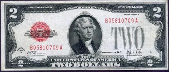 << серия 1928 г.Банкнота $2 1928B г. серии, красная печать слева, подписи Woods-MillsПортрет - Томас Джеферсон, на обороте - поместье Джеферсона Монтичелло (от итальянского "Маленькая гора"). Номера по каталогам: KL#1615, Fr#1503: