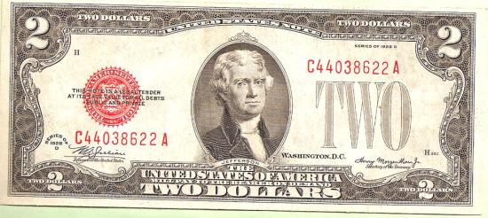 Легендарная банкнота США - Банкнота $2 1928D г. серии, красная печать слева, подписи Julian-Vinson
