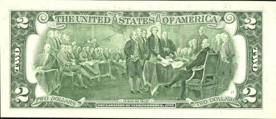<< серия 1995 г.Банкнота $2 1995 г., ремейк юбилейной серии, A - Бостон, подписи Wilthrow-Rubin. Замещенный "звездный" номер. Печатались только для коллекционеров и не выпускались в оборот.Напечатано всего 9.999 экземпляров. Портрет - Томас Джефферсон, на обороте - подписание Декларации независимости 1776 г.
