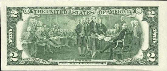 << серия 1995 г.Банкнота $2 1995 г., ремейк юбилейной серии, D - Кливленд, подписи Wilthrow-Rubin. Замещенный "звездный" номер. Печатались только для коллекционеров и не выпускались в оборот.Напечатано всего 9.999 экземпляров. Портрет - Томас Джефферсон, на обороте - подписание Декларации независимости 1776 г.