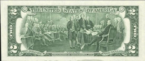 << серия 1995 г.Банкнота $2 1995 г., ремейк юбилейной серии, J - Канзас Сити, подписи Wilthrow-Rubin. Замещенный "звездный" номер. Печатались только для коллекционеров и не выпускались в оборот.Напечатано всего 9.999 экземпляров. Портрет - Томас Джефферсон, на обороте - подписание Декларации независимости 1776 г.
