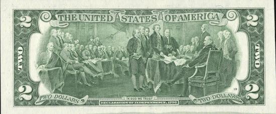 << серия 1995 г.Банкнота $2 1995 г., ремейк юбилейной серии, L - Сан-Франциско, подписи Wilthrow-Rubin. Замещенный "звездный" номер. Печатались только для коллекционеров и не выпускались в оборот.Напечатано всего 9.999 экземпляров. Портрет - Томас Джефферсон, на обороте - подписание Декларации независимости 1776 г.