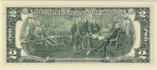 << серия 2003 г.Банкнота 2 доллара 2003 года - Ремейк юбилейной серии 1976 г., I - Миннеаполис, подписи Marin и Snow. Замещенный номер - "звезда".Всего напечатано 3.840.000 - были выпущены в обращение обычным путем. Портрет - Томас Джефферсон, на обороте - подписание Декларации независимости 1776 г.